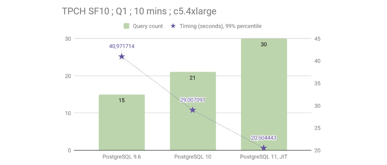 Postgres 11 引入一个新的JIT表达式编译器,它在20.5s内以10的比例因子显示执行TPC-H Q1的速度提高了29.31%(而不是Postgres 10的29s) DIMITRI FONTAINE